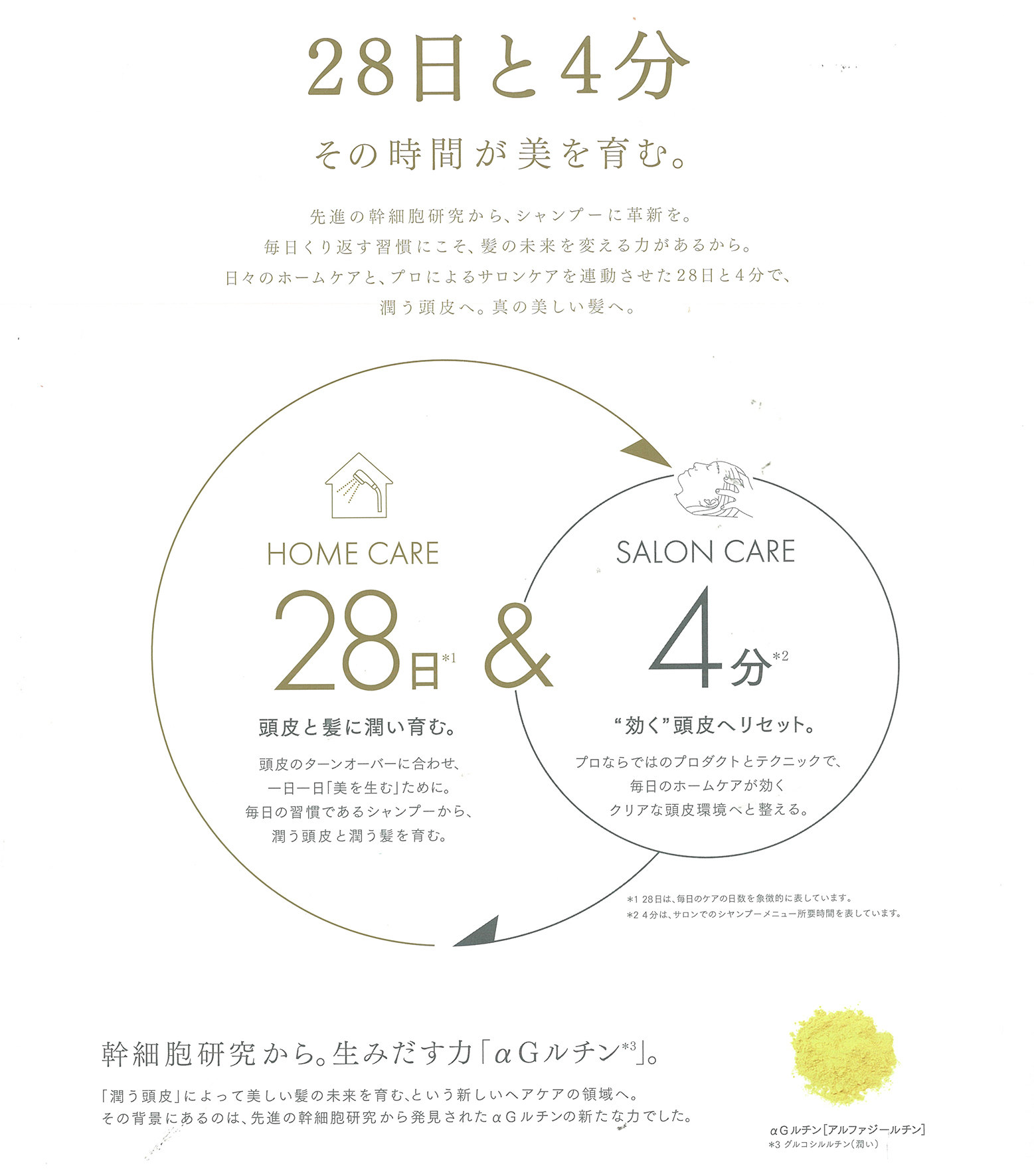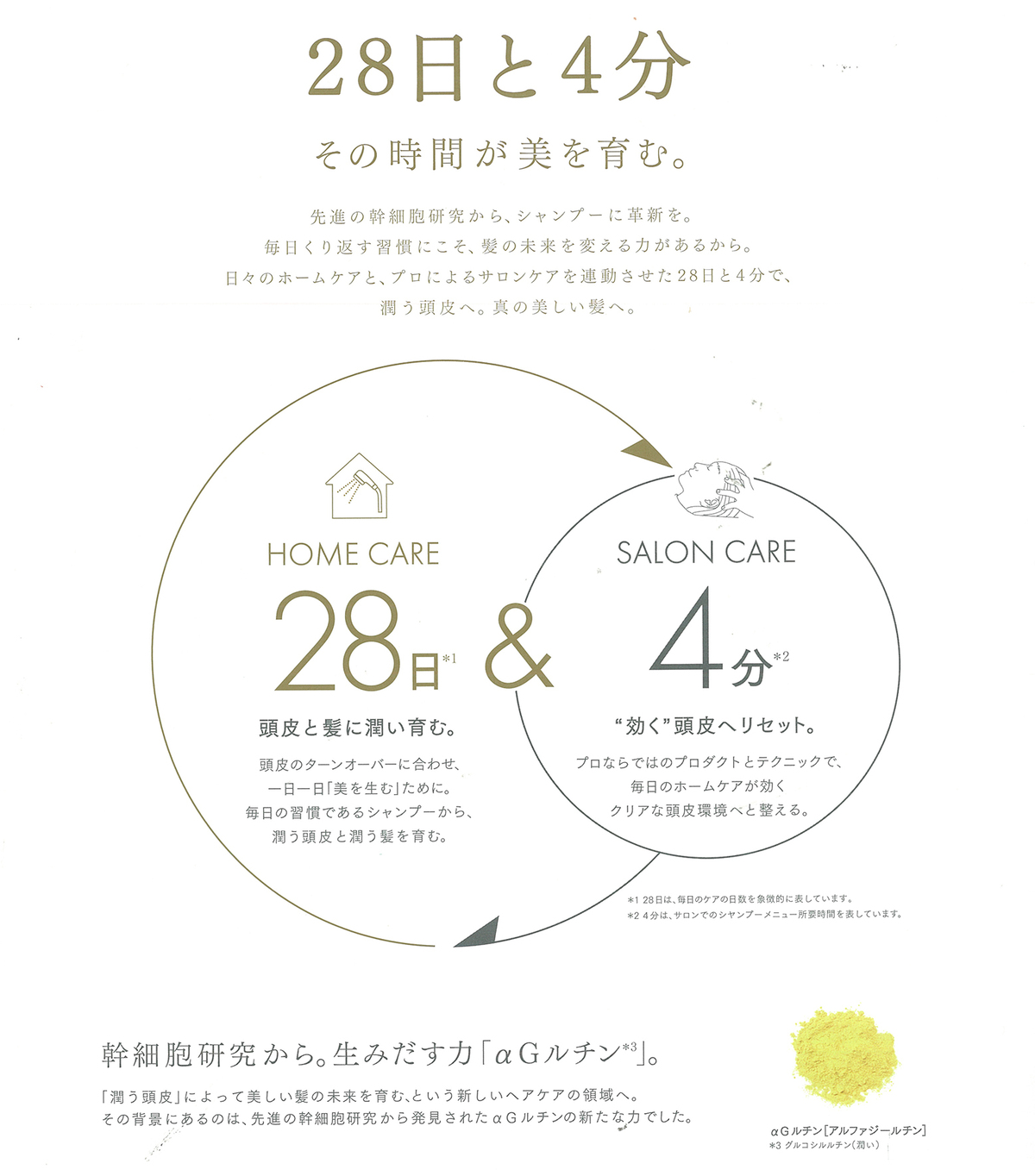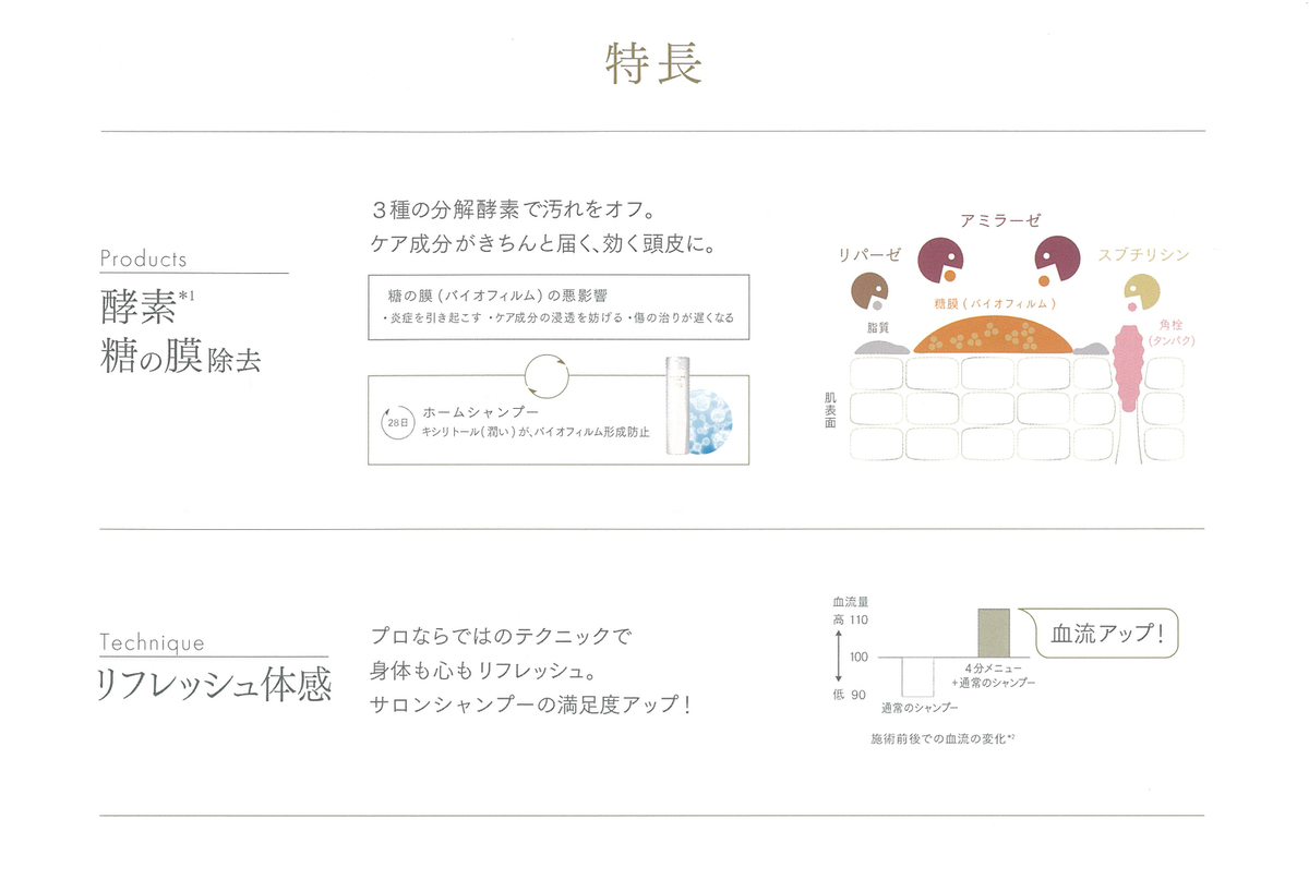 αGルチン(幹細胞研究由来成分)の作用で、サロンケアの潤いを保ち続ける事ができます。乾燥によるかゆみやフケへの効果には即効性があります。